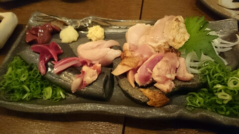 JUGEMテーマ:居酒屋 神田駅西口に今年3月にできた「鶏家 六角鶏 神田店」初挑戦。 鶏の生食などもあり、こだわったお店。 鶏の刺身盛り合わせ 軽く火は通してあるようですが、そこいらの居酒屋チェーンでは食べることができないクオリティ。 ダチョウのたたき。 タレをかけた写真ですが、タレは別皿で提供されます。 山芋のポテトフライ ホクホク つくねの盛り合わせ。 お店一押しメニューのようです。 用意に時間がかかる逸品。 串、珍しい部位ばかり頼んでみました。 最後に卵焼き。 箸を...