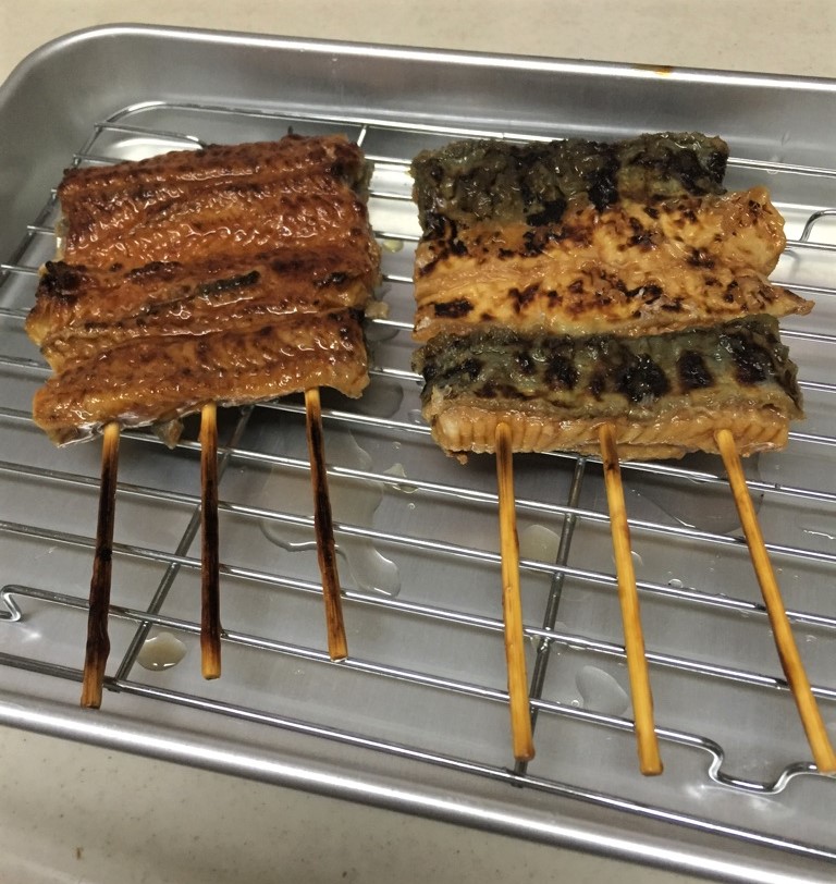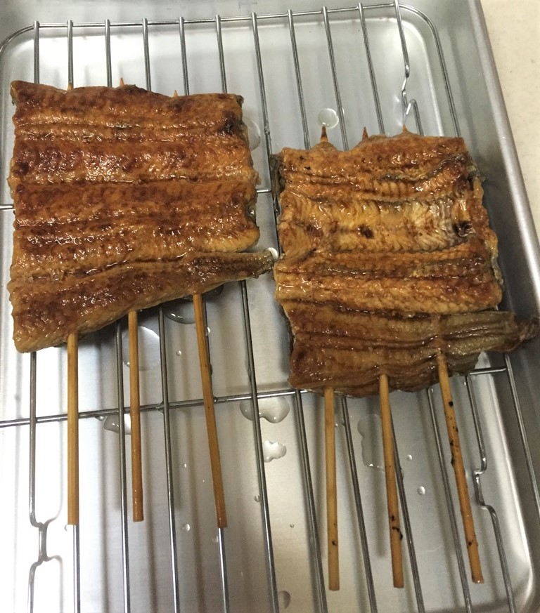 JUGEMテーマ:食しました。 今日のランチは私がつくりました。スーパーで中国産の串ウナギ ¥590-/本 2本買い妻、私の2名分を前回レシピから進化させた調理法でつくってみました。(ずっと前からトライしてみようと考えていたんです) 【パックから出し 表、裏側をゴシゴシ洗い、銀ホイルに包み中火で10分蒸します】 【今回のアレンジは蒸したウナギを「オーブントースターで加熱」しながらタレを刷毛で塗ります】 【焼きながらタレをつけるから家中がウナギかば焼きのいい香りです。】 ...