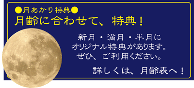 当店では、月の満ち欠けによって、 特典があります! http://shine-moony.com/getsurei.html 主に、新月と、満月と、半月です。 新月と満月は、メニューや、お料理、ドリンクなどの内容で、 半月は、当店オリジナルのパソコンとiPhoneの壁紙だったり、 その他面白いグッズだったりと、特典の内容が異なります そして、今日は、満月デーです!5%OFFの日です。 http://shine-moony.com/menu.html 今日も18時からオープンしておりますので、ぜひご来店くださいね 特典の内容は、毎月異なりますので...
