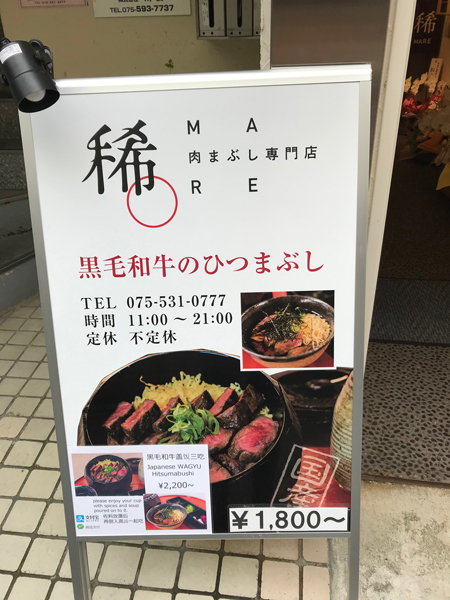 ひつまぶし未経験の私が、鰻のひつまぶしではなく、和牛ステーキのひつまぶしをいただきました。 『肉まぶし専門店 稀(まれ)』 祇園花月南側細い道にあるとても目立たない立地条件。 呼び込みの女の子が可愛くなかったら、まちがいなく素通りしていた。 エントランスに段差がある。 まだ新しいお店のようでエントランスに花が並んでいた。 店内はカウンター席と、奥に2人掛けテーブルが3つ。 前はスナックか、...