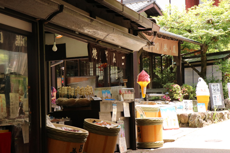 三千院の景色は時間を忘れる美しさ。うっかり中で燃料切れにならないように、拝観前に軽く何か食べておきたい。 お勧めは、参道途中にある「しそソフトクリーム」。 大原バス停から三千院に向かう参道は、小川(呂川)沿いの急な坂道。 この急な坂道の途中に飲食店や土産物屋が並ぶ。ソフトクリームの看板があるのが『呂川茶屋』。 店先で腰を掛け、一休みするには気持ちの良い場所。 女将さん(?)ひとりで土産物屋を仕切って...