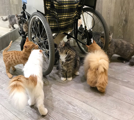 小猫ちゃんに囲まれて酒池肉林☆ それが人生最大の夢・・・ でも・・・ こっちの“小猫ちゃん”じゃな〜〜〜いっっっ!! 猫カフェに入ったら、車椅子に興味を示した猫に取り囲まれてしまった。 車椅子が動くたびに、スポークの光にひかれて取り囲む。 しかもこの猫カフェは10分ごとに200円の課金がされる。 なのにこの状態では店から出られない。 なんと商売上手な小猫ちゃん。。。 Σ( ̄_ ̄|||) もし、タイヤで猫を踏んだら、 『ネコふん...