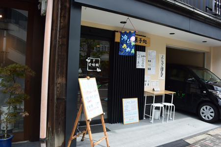 三条京阪から東山二条のゾーンは通な寺社巡りコース。炎天下の二条通りを西へ進んでいたら、“水無月”と“いちご大福”の登り旗。 これだけなら前を素通りしていたが、“冷やしあめ”のメニューに進みを急ブレーキ。 小回りの利く車椅子なら冷房の利いた中のテーブル席でひと休みできます。 先を急いでたので、外で“冷やしあめ”を立ち飲みにしました。 本来“冷やしあめ”は冷たいドリンクなのですが、このお店の“冷やしあめ”は氷が満杯...