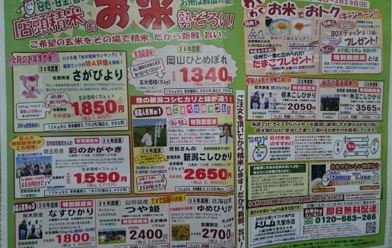 JUGEMテーマ:おいしいお米 お待ちかね、お米チラシの週がやってきました! 玄米2000円以上お買上げのお客様に、長野県知事賞を受賞した玉子(浅間小町)6個入りをプレゼントしています! 本当に美味しい玉子なので、毎回みなさまに喜んでいただいています♪ 最近曽我さんの新潟こしひかりの売れ方が今まで以上にすごい! お米はとにかく美味しいのを食べたい。そんなお客様に一番オススメしたいお米です★ そういえば、そろそろ来週あたりには、桜が咲き始めるみたいです。 お花見の幹事さん、冷やし・配...