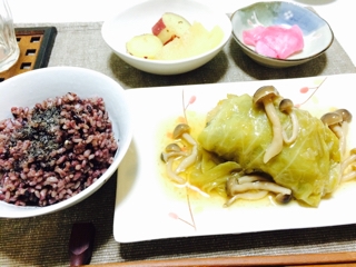 今日は、江藤さんの無農薬の玄米に黒米を混ぜて炊きました。 ごま塩かけて、本当に美味しい! ロールキャベツを、ヘルシーなダイエットモードに。 さて、キャベツの中身はなんでしょう?(^-^) 切干し大根、人参、油揚げ、しいたけをみじん切りにして、さっとしょうゆ味で煮て、、 鳥のひき肉と、おからに、切干し大根の煮物を混ぜて、ロールキャベツの種にしました。 切干し大根の戻し汁をベースに、和風に味を整えて、シメジと煮込んで、あんかけに。 満腹感もあり、食物繊維いっぱいの食事になりました...