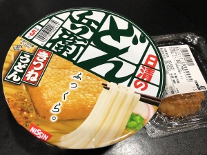 突っ張り棒の寸法間違えて買って使えんかった、@おざさです。 ということで。 今日のお昼は・・・ 「日清 どん兵衛 きつねうどん にコロッケをトッピング」です。 牧のうどんでトッピングに「コロッケ」があって マジか!?と食わず嫌いでいたのですが、 試しに食べるとコロッケが出汁を吸ってとても美味! それを今回、カップうどんでトライです。 サニーの惣菜コーナーで野菜コロッケ(47円税別)を購入、 お湯を沸かして準備です。 日清のそれは、おあげと粉スープ、七味唐辛...