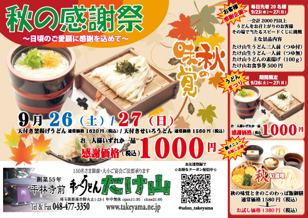 JUGEMテーマ:うどん 日頃より、手のべうどんたけ山をご愛顧いただき、誠にありがとうございます。 以下の日程で感謝祭を実施しております。 9月23日(水)〜27日(日) 毎日先着20名様スピードくじに挑戦 一会計2000円以上、ランチおうどんをお召し上がりのお客様に限ります 9月26日(土)〜27日(日) うどん祭り 天ぷら付きせいろ・釜揚げうどん 税込1000円