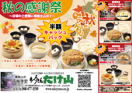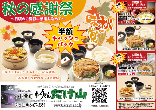 JUGEMテーマ:うどん 第一弾 9/14(土)〜16(月) 東坡肉わっぱ飯御膳 −茹でる・焼く・煮る・蒸すと手間暇かけたスペシャルなわっぱ飯です 栗ご飯 −うどんをお召し上がりのお客様限定感謝価格 310円→210円(税抜) 第二弾 9/21(土)〜23(月) 鮭といくらのわっぱ飯御膳 −この時期だからこその贅沢なわっぱ飯です 栗ご飯 −うどんをお召し上がりのお客様限定感謝価格 310円→210円(税抜) 対象期間中の税抜お食事代金の50%キャッシュバック 10/1〜10/31に使えるお食事券として使えます