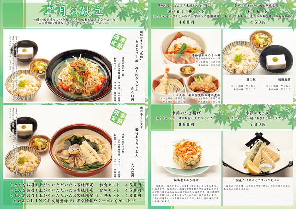 JUGEMテーマ:うどん 季節のうどん 冷し坦々うどん / 若竹あさりうどん 季節の炊込み 筍ご飯 季節の天ぷら 筍とアスパラの天ぷら 季節のかき揚 桜海老のかき揚
