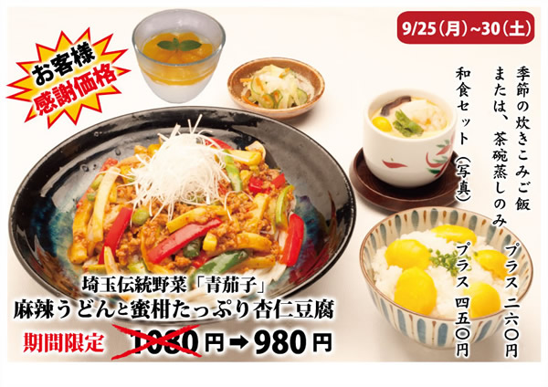 JUGEMテーマ:うどん 秋も深まり、楓は紅、銀杏は黄金、はなやかな錦の秋となりました。甘くて、柔らかい、深谷ねぎを使って、錦秋の献立に仕上げました。深谷ねぎの特徴は、繊維のきめが細かく柔らかく、糖度が高く甘いことです。疲労回復に効果があるビタミン の吸収を助け、その効果をアップしてくれます。 鴨南蛮和食セット彩の国黒豚と深谷葱の肉汁うどん大山どりと深谷葱の葱チャーシューうどん「熟成インカのめざめ」じゃがいもご飯選べるミニ丼