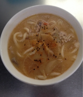 JUGEMテーマ:うどん 白桔梗作・即席豚汁うどん やあ、また君か。 君も長いことこのブログに来てくれて、本当ヒマなんあだなと思うよ。 まあ、君の人生だから好きにするといいよ。 豚汁が余ってしまったので 前の晩に豚汁が出たんだけどさ、大量に余ってしまったんだ。 勿体ないから、ランチに再利用してみた。 一晩置いた豚汁は、具にしっかり味がしみていて味わい深いよ。 そこへ、うどんを投入したんだ。そう、豚汁うどんさ。 本当ならもっと寒い時期に食べるともっと美味しかったんだけど...