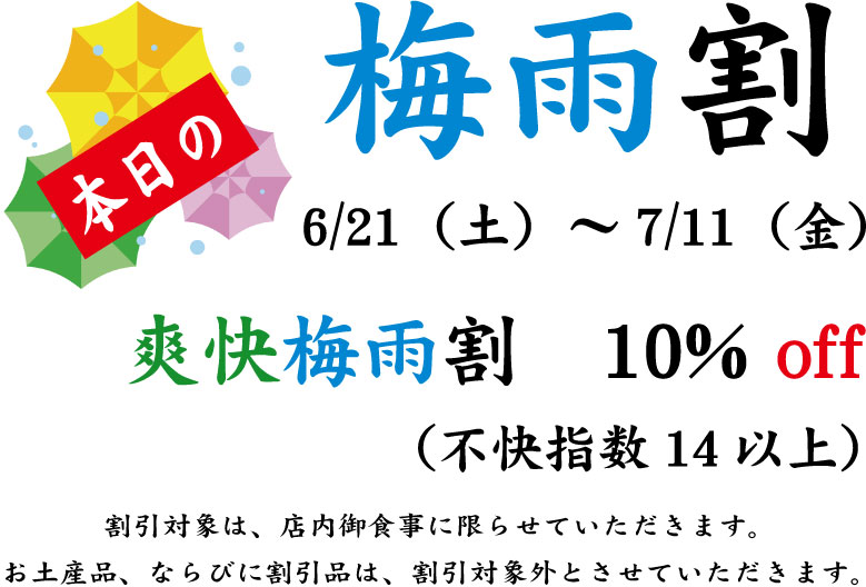 JUGEMテーマ:うどん 本日より、梅雨割りキャンペーンスタートです。 ムシムシ・ジメジメ不快な梅雨をたけ山で気分爽快に・・・ 内容は、気温×湿度(%)で不快指数を計算し、その指数で割引率が変わります。 不快指数が、18以上で超爽快梅雨割20%オフ 不快指数が、14以上で爽快梅雨割 10%オフ 不快指数が、10以上で梅雨割 5%オフ 皆様、不快な梅雨をたけ山で気分爽快になってください。