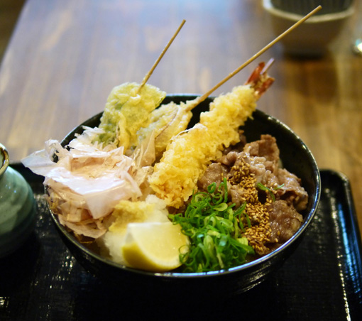 西梅田の桜橋から55番バスに乗って、会社帰りに行きました。「京町掘2丁目」で降りてすぐ。あみだ池筋のうつぼ公園の北、西側。(ラーメン香澄の向かいあたり)「うどん家あぶく」は、2013年オープン、キレイで空間も広い店。うどん屋さんながら、揚げ物系が充実。揚げ物などのの定食も食べられる。今回は、メニューで赤表示の看板メニュー、「黒毛和牛を使った串天肉ぶっかけ」をいただきました。meets の麺特集で写真を見て、すごく気になってた。牛肉煮込みのぶっかけうどんに、エビ、ピーマン、レンコンの串カツが3本。「おおっ...