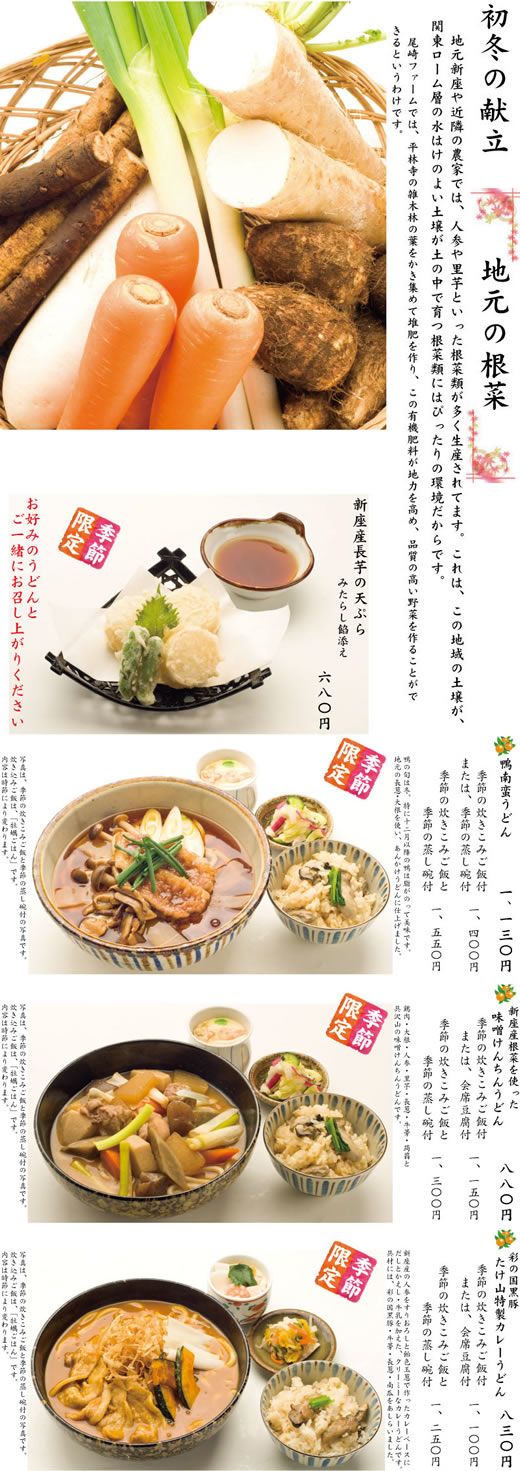 JUGEMテーマ:うどん2013/12/13から初冬の献立始まりました。テーマ食材は、地元の根菜です。牛蒡・人参・大根・里芋・長葱を使った新作メニューです。 冬の代表的な野菜といえば、ごぼう、ショウガ、にんじん、サツマイモ、里芋、大根などの根菜類だ。これらの根菜類には、身体を温める効果がある。寒気が身にしみる今日このごろ、身体を内側から温めていきたい。 microdiet.netの調査レポートによると、根菜類は水分が少なく、ビタミンC、ビタミンE、鉄などのミネラルが豊富に含まれている。ミネラルは、体温を維持するのに必要不可...