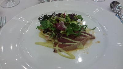 JUGEMテーマ:フランス料理 結婚式場セレッソ内の レストラン「YOME処」 でランチしました。 まずはオードブル。 マグロのカルパッチョ。 マグロのたたきのようなのに、 野菜がたっぷりのって、 ソースはわさびのきいた ソースで、マグロに とてもよく合いました。 そら豆のスープ。 そら豆の素朴な味わいが よく出ていました。 メインデイッシュです。 左、ポークソテーのバルサミコソース。 右、カンパチのソテーバジルソース、 真ん中、焼き野菜。だと思います。 お肉も、魚も とっ...