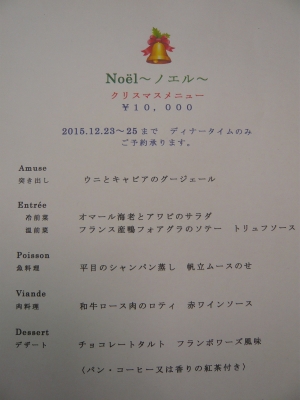 JUGEMテーマ:フランス料理 お待たせいたしました! クリスマスの営業&メニューの詳細が決定いたしました!! クリスマス期間は12月23日(水)〜25日(金)までのディナー営業のみとなります。 クリスマスメニューはウニ・キャビア・オマール海老・アワビ・トリュフ・フォアグラ・ヒラメ・和牛など高級食材を使用した満足の全8品で1万円のコースとなっております。(仕入れにより変更有り) クリスマス期間中はランチ営業はいたしませんのでご了承くださいm(__)m ご予約お待ちしております(^O^)/ &nb...