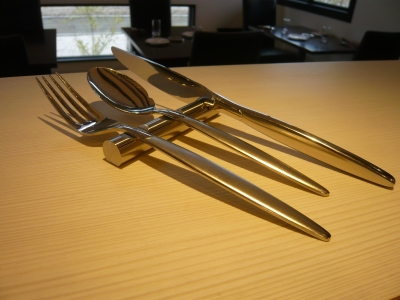 JUGEMテーマ:フランス料理 当店の3代目カトラリーレストです。 2代目は石製のもので、見た目の異質感が良かったのですが割れやすく・・・。 初代はステンレスだったのですが、軽過ぎてカシャンカシャンと音がうるさく・・・。 そして探し求めた結果、重量感のある3代目カトラリーレストを発見しました! こちらは岐阜にある製作所で作っていただいたステンレス製のものなのですが、 質量200gもあり、安定していて落としても割れない!(←多分、床の方が心配・・・(;_;)) ナイフを立てて置く感じもなんだ...