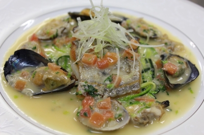 こんばんは。 今週のメニューが出来ました 太刀魚とムール貝と浅利のマリニェール風 ズッキーニの細切りの上に太刀魚のグリルを乗せて ムール貝と浅利のだし汁にバターとレモンで味を整え トマト・セロリの葉・パセリをあしらい セロリの千切り(ジュリアン)を飾りました。 若鳥の網焼きカルバドスシードル酒のクリームソース 付け合わせは、青梗菜・キャログラ・ポテトの玉子焼き。 チキンの下にはクスクスをしきました。 ソースはカルバドスとシードル酒(りんごのスパークリングワイン) スープはシャンピ...