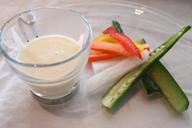 JUGEMテーマ:フランス料理 彩り野菜のバーニャカウダ鶏モモ肉のソテー キノコのリゾット 冬瓜のソースで海老と枝豆の豆腐ハンバーグ仕立て サラダと一緒にアメリケーヌソースで