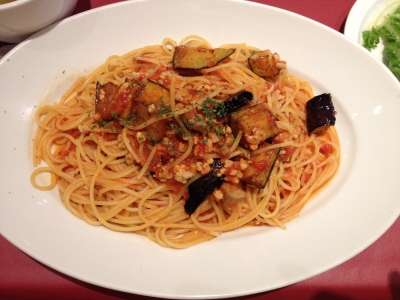 「マッテオ 銀座店」のランチのピザがうま!と教えてもらったのに、 なぜかパスタをオーダーしてしまった私。。。 揚げ茄子とお肉のスパゲティ。 さらにサラダ、スープ、デザート、ドリンクがついて950円。 パスタの量が多いー!味はそこそこ。 今度はぜったいにピザにする。 極薄のクリスピータイプなんだそうで、、 マッテオ 銀座店 http://www.giraud.co.jp/matteo/index.html マッテオ 銀座店 (ピザ / 内幸町駅、銀座駅、日比谷駅) 昼総合点★★★☆☆ 3.0