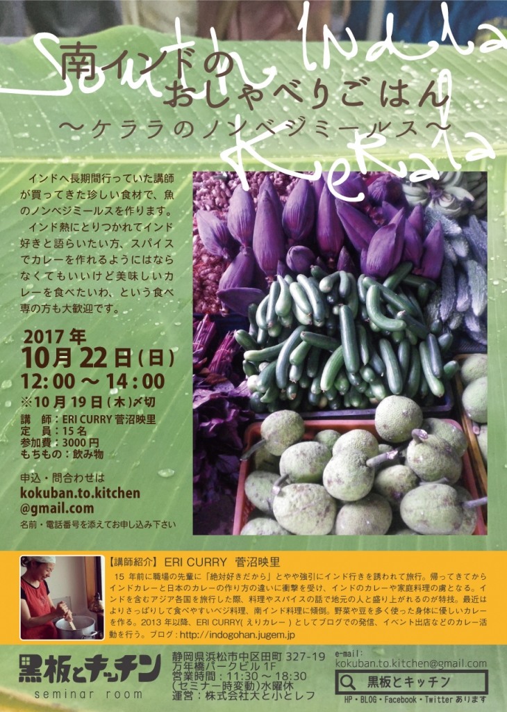 JUGEMテーマ:インド料理・カレー 昨日から一気に気温が下がりました。 満月を眺めて、もうすっかり秋なのだなぁと実感しています。 季節の変わり目、気温調節が難しいところですね。 さて、次の黒板とキッチンのスパイスカレー講座は、 「南インドのおしゃべりごはん〜ケララのノンベジミールス〜」 と題しまして、ケララで買ってきたレアな食材でごはんを作ります。 いつもの講座は実習形式なので、たまにはじっくり眺めたい、しゃべりたい。 料理を作れなくてもよいけど、講座の雰囲気を味わっ...