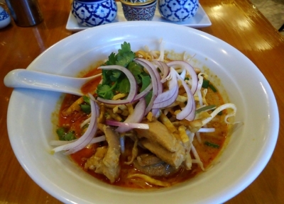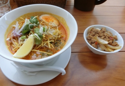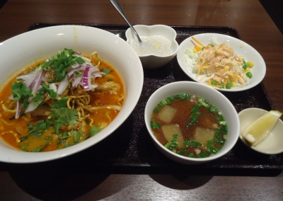 愛宕グリーンヒルズのタイ料理「BANGKOK SMILE バンコクスマイル」でランチしました♪ チェンマイカレーヌードル カオ・ソーイ ミニガパオ付 1,080円 (単品 980円) 高さのある器で 具は 鶏肉たっぷり、味付き半熟卵、もやし、赤玉ねぎ、パクチー、高菜のようなもの 普通においしかったけれど、もう少しスパイスを感じる方が好き。 ガパオの方が辛かった。 メニュー ⇒ BANGKOK SMILE バンコクスマイル &n...