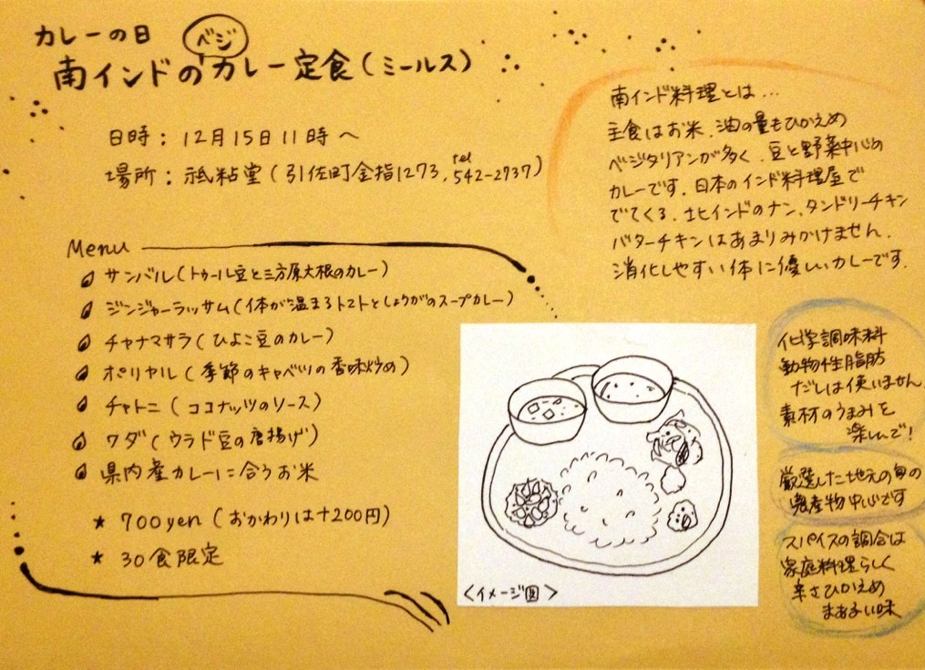 今年も早いもので、もう師走。 一気に冬がきたかんじがします。 12月は祇粘堂で出店します。 かつてないスペシャルミールス!乞うご期待!! なんとなしにはじめたカレー出店も回を重ねて、今回で6回目。 やり続ければ100回とか、1000回とか行くのでしょうか? 今までなかなか減らなかったヒングも何本も使い切って自分でもビックリ。 のんびりペースなので、いつになるか分かりませんが、 少しずつレシピを増やして、来年も再来年も続けていけたらいいなぁ、 なんてぼんやり思ってます。 さて、試作を重ねる日々です...