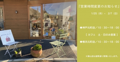 『 営業時間変更のお知らせ 』 いつもポワソンドパリをご愛顧いただき誠にありがとうございます。 先日、緊急事態宣言に伴い、横浜元町店・神戸元町店の営業時間の短縮のお知らせをさせて頂きました。 本日、1月25日(月)より、さらに神戸元町店のカフェ部門の営業を土・日のみとさせて頂くことにいたしました。 皆様には、ご不便をお掛けしますが、何卒よろしくお願い申し上げます。 何かご不明な点等ございまございましたら、お気軽にご連絡くださいませ。 『 営業時間変更の期間:1/25(月)~ 2/7(...