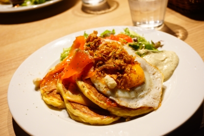 ニットの次に向かったのは、徒歩数分のところにあるトミィ。老舗のホットケーキ巡りには欠かせないお店の一つですよね♡前回のフルーツバーグが美味しすぎて、絶対また来たいと思っていたので嬉しい!珈琲を頂きながら、焼き立てを待つ瞬間というのはどうしてこうも幸福なのでしょう…。そして、やって来た2種類のホットケーキたち!まずは王道プレーン♡舌べらみたいにオマケがくっついてますwもう一つは、このお店の特徴でもある種類豊富なお食事ホットケーキたちの中から、気になっていたコーン入りチーズバーグ。およそ...