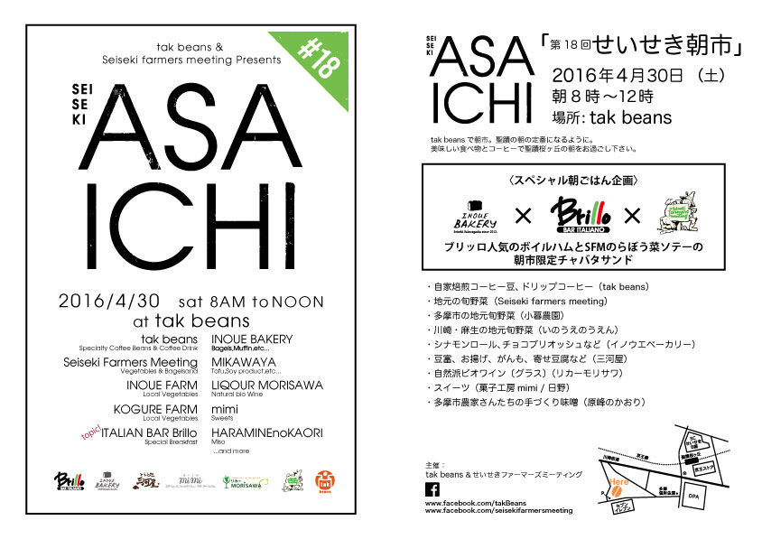 おはようございます。 雨の木曜スタート。 昨日もご来店ありがとうございました。 降るかなと思っていましたが夜中からの雨。 いよいよ迫ってきたゴールデンウィーク。 お客さまと話していると、今夜から旅立ちます。 なんて方も。事故等にはお気をつけ下さい。 tak beansでは、4/30(土)は【せいせき朝市】開催 です。ラインンアップは以下をご覧下さい。 ●せいせきの朝ごはん → Brillo人気のボイルハムとSeiseki farmers meetingの のらぼう菜ソテーの朝市限定チャバタサンド ●イノウエベーカリー &rar...