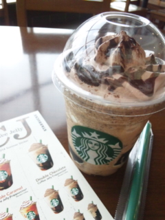 JUGEMテーマ:スターバックス ↓で貰ったドリンク無料券を昨日使ってきました。 http://spring-nao.jugem.jp/?eid=296 (スターバックスカードに5,000円以上チャージするだけでドリンク無料券が1枚もらえるキャンペーン) 使用期限まで残り半月くらいありますが、忘れないうちに・・・というかスタバに行く途中に思い出したので。 注文したのは予定通りフラペチーノ。 店員さんから期間限定の商品「ダブル チョコレート コーヒー ジェリー フラペチーノ」を勧められたので、そのまま採用(笑) サイズ=グランデも予...