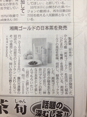 JUGEMテーマ:日本茶 2013年11月8日(金)の産経新聞に湘南ゴールド緑茶「ひだまり」が掲載されました。神奈川ブランドのお茶として人気のひだまり。残りの数がだいぶ限られてしまっていて茶来未ではオンラインでの販売は来年5月頃までは一旦お休みさせて頂いております・・店舗では少量ですが販売しております。他、取り扱って頂いているお店は・ecomo(エコモ)さま(藤沢市) http://www.ecomo-lohas.com/・かながわ屋さま(横浜市) http://www.kanagawaya.com/上記2店舗と・・・「京急百貨店さま(横浜市上大岡)」では、お歳暮のギ...
