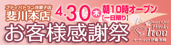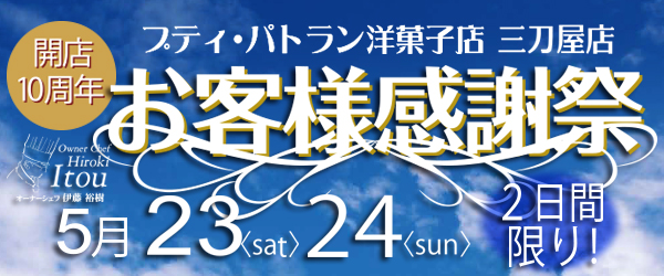 いつもご来店ありがとうございます。 プティ・パトラン洋菓子店 三刀屋店はこのたび10周年を迎えることとなりました。 ひとえに皆様のご愛顧のおかげと感謝しております。 5月23日(土)・24日(日)の2日間 感謝を込めまして お客様感謝祭を開催いたします。 2日間限りのイベントとなりますので、ぜひご来店ください。 スタッフ一同お待ちしております ●2000円以上のお買い上げで500円のサービス券を進呈いたします これからもひとつひとつの商品を心を込めてお客様にお届けいたします。 今後ともど...