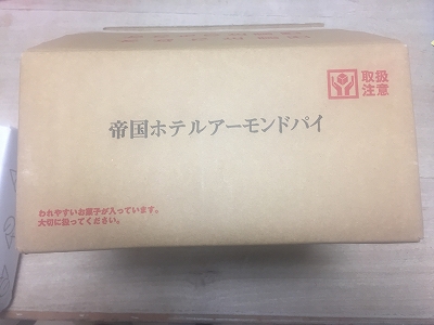今週、他界した母の親友のNちゃん(年上の方ですが)からお歳暮を頂きました!!(万歳) いつも、高級で美味しい物を頂き本当に家族一同感謝しております。 今回は以前頂き、取りあいになりました「帝国ホテルのアーモンドパイ」です。 この間は気がつきませんでしたが、ダンボールにも「帝国ホテルのアーモンドパイ」の印字が! 開けますとご丁寧に包装されており、またアルファベットで茶色の箱に 「IMPERIAL HOTEL ALMOND PIE」と印字が・・...
