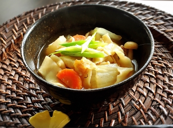 今日ははじめて 群馬の郷土料理 「おきりこみ(おっきりこみ)」 ケンミンSHOWで紹介されていて、 これならアメリカで揃えることができる具材でも作れる!と思って挑戦してみました。 フィリップスの製麺機を使って (蕎麦を作った時の写真) 今回はラザニア生地のアタッチメントでのした生地を幅広にカット。 塩を入れないそうで、このためにコシは無いのだそう。 生地を包丁で切りこんな感じで小麦粉をまぶしてスタンバイ。 300gの中力粉で製麺して3人分くらいかな?と思っ...