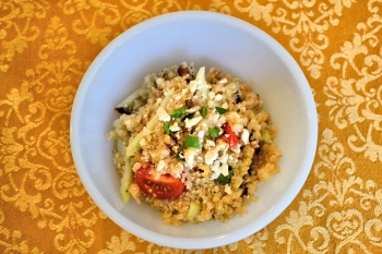 日本でも話題の 奇跡の食材といわれているキヌア15年くらい前日本で雑穀米が流行りだしたとき、アメリカでは買うことができなかったので何も知らず キヌアをご飯に入れて食べていました。最近はご無沙汰だったのでアメリカや日本で話題になり始めてふたたび頻繁にいろんなお料理に使うようになりました。このサラダは近所の地中海料理店で食べたサラダを再現したくて 作ってみました。女友達や娘たちからの評判が高かくてちょっと 舞い上がってしまったレシピです(笑)。冷蔵庫で冷やしておくとおやつ代わりに、朝ごはんや 軽食...
