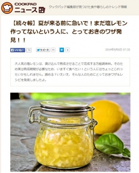 おはようございます!夕べお友達とワイングラス片手にぺちゃくちゃしている時(笑)ふと FBを開けてみるとん?見慣れた写真が・・・もしや?先日アップした 超スピード!3時間で塩レモン by Little Darling あの塩レモンを1ヵ月待たなくても、良いんです!しゃかしゃか振って3時間待つだけ! いろんな料理に使えます。大々的に取り上げていただいたようです。おまけに編集部で実際に作っていただきつくれぽいただきました!続きは こちらから今作って3時間後にあの 塩レモンが出来上がり!いらっちな方もそ...