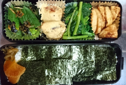 JUGEMテーマ:宅呑み・一人ご飯に!簡単レシピ♪ お弁当シリーズ3週目! 主人のお弁当を作る時には、なるべくノンオイルのおかずも入れる ようにしています。 ただ、絶対に守らなきゃ!とやっているわけではなく、出来るだけ 頑張ってみる。という、とってもゆるいルールです。 今回のメニュー ・おくら海苔和え ・冷凍つくねの味噌チーズソース ・ほうれん草の胡麻和え ・たけのこのバターしょうゆ焼き (・海苔ごはん) <おくら海苔和え> おくらのヘタの...