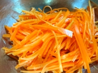JUGEMテーマ:宅呑み・一人ご飯に!簡単レシピ♪ 暑い日が続きます。 食事もなるべく涼しげなメニューを用意したいですよね。 やっぱり酢の物は外せません! 人参の酢の物 <材料(3〜4人分)> 人参・・・1本 ちくわ・・・3本 乾燥わかめ・・・1つまみ 梅干し・・・2個 白だし・・・小さじ1/2 米酢・・・大さじ1 みりん・・・小さじ2 白ごま・・・少々 塩・・・1つまみ 砂糖・・・少々 <作り方> ?にんじんの皮を剥いて、細切りにする。...