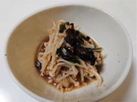 JUGEMテーマ:宅呑み・一人ご飯に!簡単レシピ♪ 秋はキノコの季節ですね。 人工栽培のものが多いですが、このキノコも天然物は今時期が旬なんだそうですよ。 えのきの中華サラダ風 <材料> えのき・・・1袋 乾燥わかめ・・・小さじ2 白ごま・・・大さじ1 黒酢(無ければ米酢)・・・大さじ1 醤油・・・小さじ2 ごま油・・・小さじ1 砂糖・・・小さじ1 おろししょうが・・・少々 <作り方> ?えのきの石突を切り取り、なるべく細かくほぐす。 ?乾燥わかめを軽...
