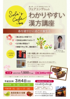 3月4日(日)に【わかりやすい漢方講座】を開催します♪ 今回のテーマは【春を健やかに過ごす養生法】!! ・春は浄化の季節です ・花粉症は病気ではない? ・五月病の原因は? ・解毒の中心「肝」、最前線の○○ をお伝えしていきます! いつも楽しく季節の養生法を教えて下さる佐々木渉先生😊 今回は元気に春を過ごせる秘訣を、あなたにもわかりやす〜く教えてくれますよ! まだまだ寒い日が続いていますが、もうすぐやってくる春の日々を気持ちよく過ごしたい! という方へ是非...