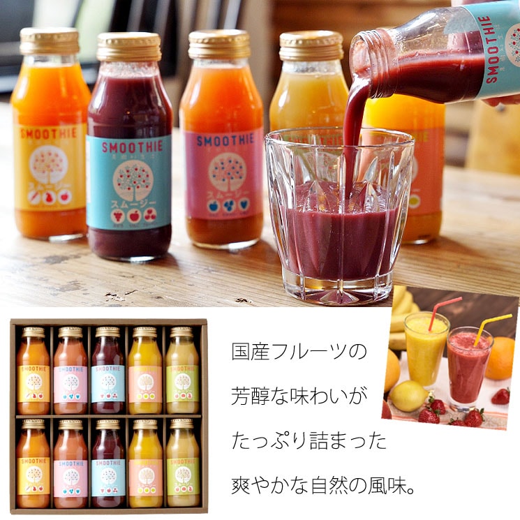 この夏! 食品バイヤーのイチオシギフトは… 国産素材で作った カラフルスムージーギフトセット です♪♪ おすすめポイント 長野県で採れた新鮮フルーツを中心に国産のフルーツだけを使用! フルーツそのままのおいしさを味わって欲しいから濃縮還元はしていません♪ 無加糖・無塩 自然なフルーツの甘みだけで作っています フルーツ自体のカラーを活かしたかわいいボトル入り 濃縮還元していないストレートジュースは ドレッシングやス...