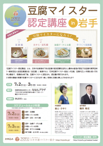 JUGEMテーマ:マクロビオティック 岩手で2年ぶりに豆腐マイスター認定講座開催! おまたせしました!2日間の講座の受講で豆腐マイスターになれますよ〜! 楽しく愉快に豆腐と親しんでみませんか?手作り豆腐をつくったり、がんもどきをつくったり、豆腐の知識と料理のレパートリーが増えちゃうお得な講座です!講師に認定された後は活動の幅も広がりますよ〜! 日本豆腐マイスター協会 代表理事の磯貝さん自ら座学の講師をしてくれます! ★チラシのダウンロードはコチラ♪ お申し込みは豆腐マイスター...