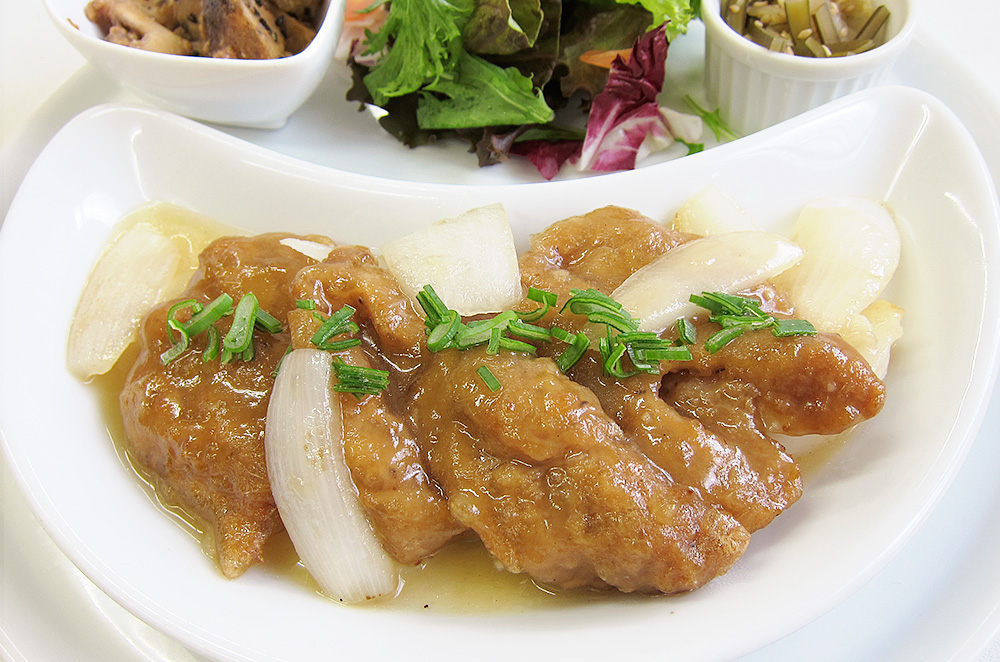 JUGEMテーマ: マクロビオティック 月のリズムプレート ¥1,000(税抜)(有機熟成三年番茶付) ※表記は本体価格(税抜)となります。精算時、消費税8%が加算されます。 【主菜】大豆ミートと新玉ねぎの生姜焼き ボリューミーな大豆ミートと甘くて美味しい新玉ねぎを生姜焼きにしました。 【スープ】新ジャガのポタージュ 新ジャガと豆乳でトロトロクリーミーなポタージュに仕上げました。 【副菜】旬の副菜2種 旬の食材を利用して、月のリズムに沿った副菜をご用意いたします。 【サラダ】 うるおい春夏秋...