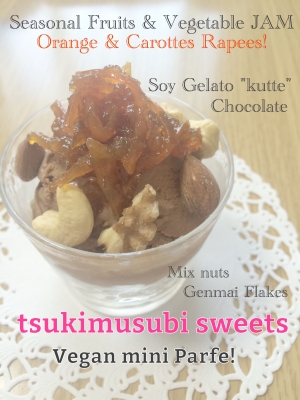 ふJUGEMテーマ:マクロビオティック 1day cafeのビーガンパフェは… 「アイス」と「ジャム」が選べます! 「ミックスナッツ」と「玄米フレーク」は、すべてのパフェに共通で入ります♪ ●アイス…CHAYAマクロビ 豆乳アイス"クーテ" ・バニラ ・抹茶 ・チョコレート ●自家製!野菜とフルーツのジャム ・オレンジ&キャロットラペ(スパイス使用) ・ミニトマト&さくらんぼ ・キウイ & レモン