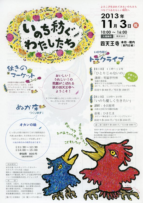 JUGEMテーマ:マクロビオティック 今回は、毎年11月3日の祝日に大阪の四天王寺にておこなわれるイベント、「いのち紡ぐわたしたち」のご案内です。今年で4回目を迎えるこのイベント、今回のトークライブは、落語家の笑福亭竹林さん「ひとりじゃないの〜子育ては楽しく〜」、京都大学原子炉実験所助教・小出裕章さん「いのち優しく生きたい」の男性陣!そう、「いのち紡ぐわたしたち」の出発点は「おかあちゃんたち」ですが、子育ては、おかあちゃんだけでするものではありませんよね。これからを支えるこどもたちの笑顔を、皆で守...