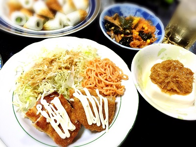 今日の晩ご飯 コロッケ&エビカツ なめたけのっけ冷奴 ちくわキュウリ しめ鯖の韓国風マリネ ハイボール 手の込んだおかずを作るのがめんどくさくて フライパンで焼くエビカツとお惣菜のコロッケが 本日のメイン料理 そこに千切り状態で売られてるキャベツ 炒めるだけの状態で売られてるナポリタンを 添えてみたよー(。´pq`)クスッ どんだけ手抜きやねん(笑) しめ鯖の韓国風マリネは昨日のしめ鯖が残ってたので COOKPADで手頃なレシピ探して作ってみたよ ◆◇しめ鯖の韓国風...