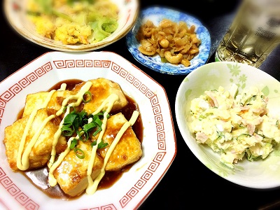 今日の晩ご飯 豆腐の照りマヨ焼き キャベツと卵の中華炒め ポテサラ カシューナッツの葱味噌炒め ハイボール 10分で!100円で!豆腐の照りマヨ焼き by みやきっちん 前々からずーっと作りたいと思ってたレシピ マヨ好きやから照りマヨって言葉に弱くて(ノ∀`) 作ってみたら案の定めっちゃ好みの味やったー♪ 簡単!キャベツと卵だけでも美味しい中華 by moj カニカマプラスでボリュームアップ( ´艸`) これも好みの味だぁ♪ さっ...