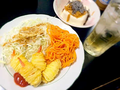 今日の晩ご飯 エビポテトロール ナポリタン 塩昆布なめたけのっけ冷奴 ハイボール 糸状に切られたポテトを 海老に巻きつけられたフライを スーパーの冷食コーナーで見つけて すっごい食べたくなったので 今夜はこういう風なおかずになった(・∀・) 海老がすっごい小さくて フライドポテトを食べてる感じにしか 思えんかったけどねー(笑) ちなみに分量的に物足りなくて しらすの佃煮のっけご飯を〆に食べたよ(*ノдノ) JUGEMテーマ:今日の晩ごはん