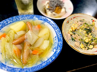 今日の晩ご飯 ポトフ 豆苗と春雨の卵炒め なめたけと塩昆布のお手軽冷奴 ハイボール 詳しいレシピはコチラ 今日は日中かなり暑かったのに なぜか冬って感じのポトフ(笑) キャベツと大根と玉ねぎがあったから あとじゃがいもと人参とウインナーを 買うだけで良かったんやもん まあ煮込んだウインナーを 食べたかっただけやけどね(´ー`)フッ 卵炒めはこの間春雨を買ってきてたので それを使って何か作れないかなぁって COOKPADを探してて見つけたレシピ ってリピなんですけど...